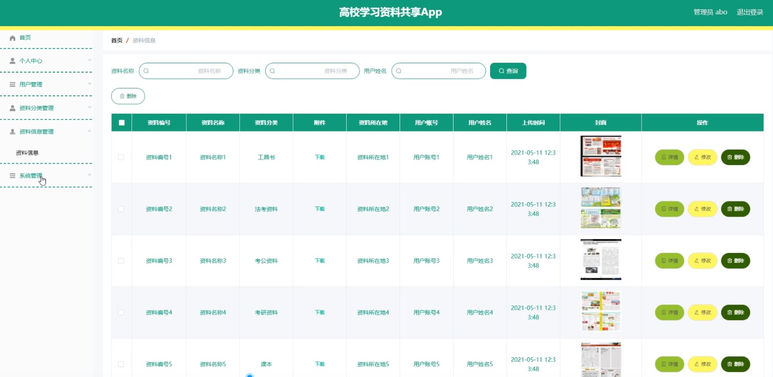 本文以Android、java为开发技术,实现了一个高校学习资料共享App。高校学习资料共享App的主要使用者分为管理员、用户,管理员:个人中心、用户管理、资料分类管理、资料信息管理、系统管理;用户:首页、资料信息、我的等功能。通过这些功能模块的设计,基本上实现了整个用户信息管理系统的过程。