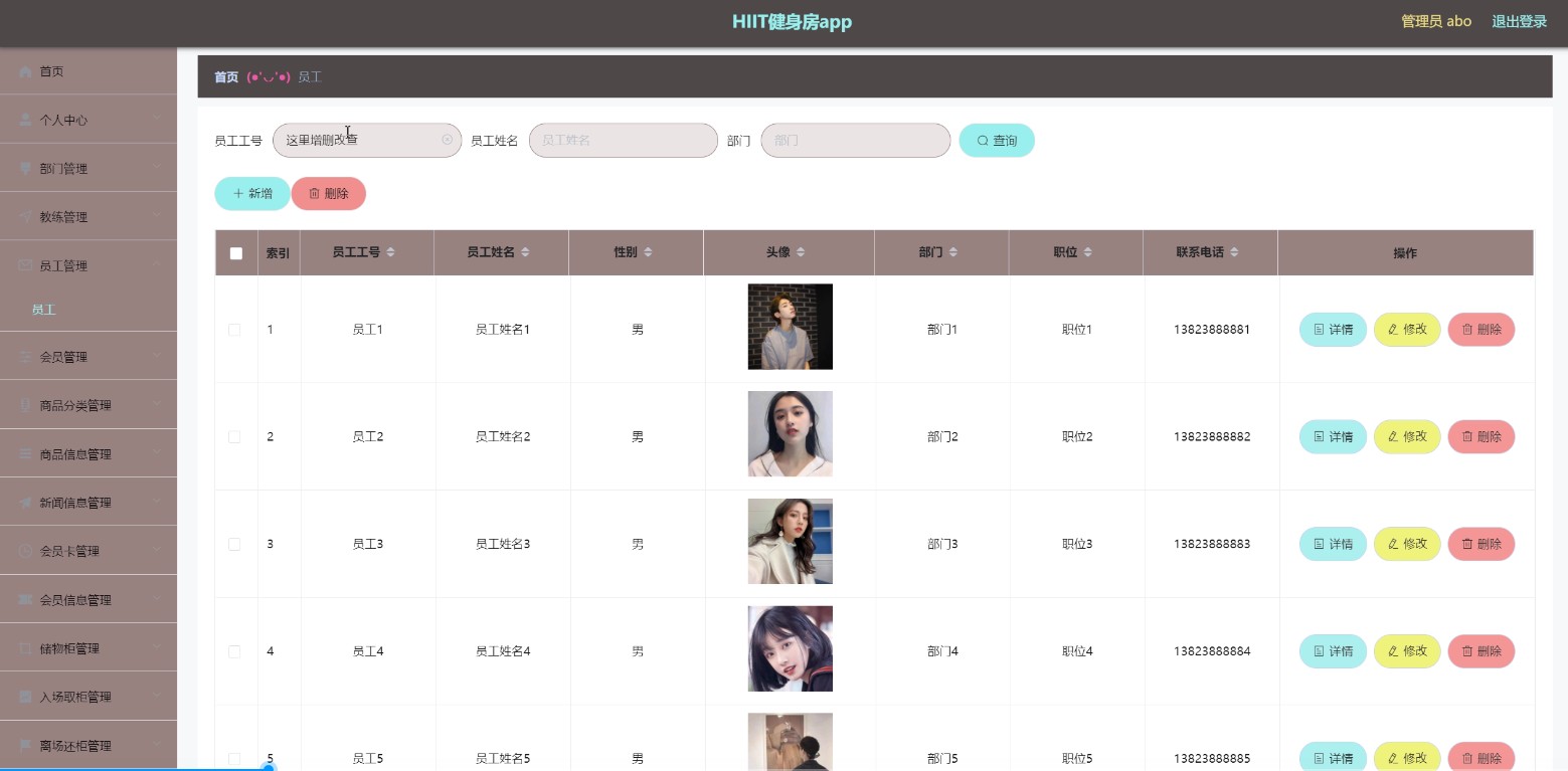 功能要求:可以管理首页、个人中心、部门管理、教练管理、员工管理、会员管理、商品分类管理、商品信息管理、新闻信息管理、会员卡管理、会员信息管理、储物柜管理、入场取柜管理、离场还柜管理、健身课程管理、报名上课管理、社区中心、系统管理等功能模块。
