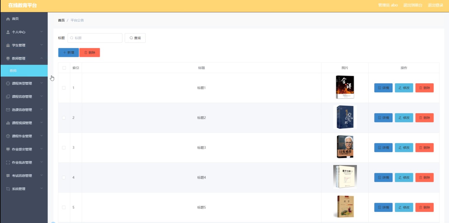 课程信息管理,在课程信息管理页面中可以对索引、课程编号、课程名称、课程类型、图片、教师工号、教师姓名等信息进行详情,修改或删除等操作