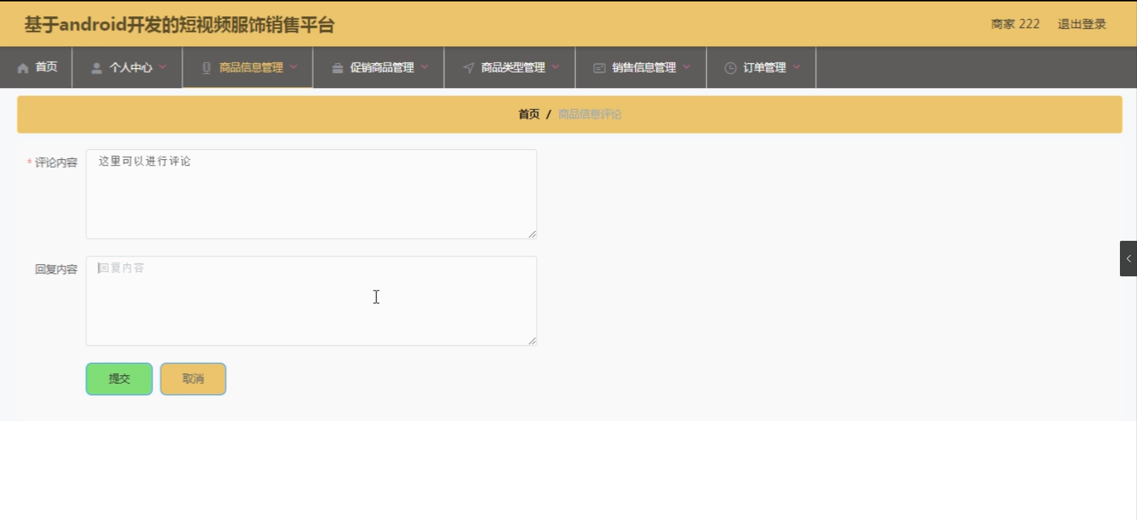 本文以Android、java为开发技术,实现了一个基于android开发的短视频服饰销售平台。基于android开发的短视频服饰销售平台的主要使用者分为管理员、用户、商家,管理员:个人中心、用户管理、商家管理、商品信息管理、促销商品信息管理、商品类型管理、销售信息管理、系统管理;用户:首页、商品信息、促销商品、我的;商家:个人中心、商品信息管理、促销商品管理、商品类型管理、销售信息管理、订单管理等功能。通过这些功能模块的设计,基本上实现了整个服饰销售平台管理系统管理的过程。